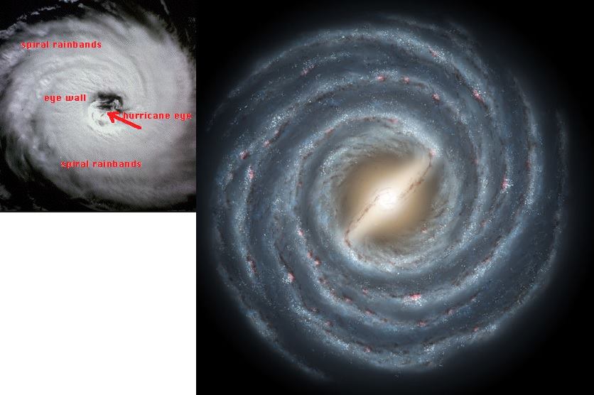 Interesting enough – there’s most likely a supermassive black hole in the middle of the galaxy pictured (on the right). Meaning…the amount of mass in the center of the galaxy has to be enough to thus have some sort of gravitational effect on the furthermost bands of the galaxy to create a form of centripetal force. Think about the amount of mass in that!! And….think about how those rubber bands are distorted when you are somehow placing a house in that tub rather than a ball. The bands are stretched and stretched….