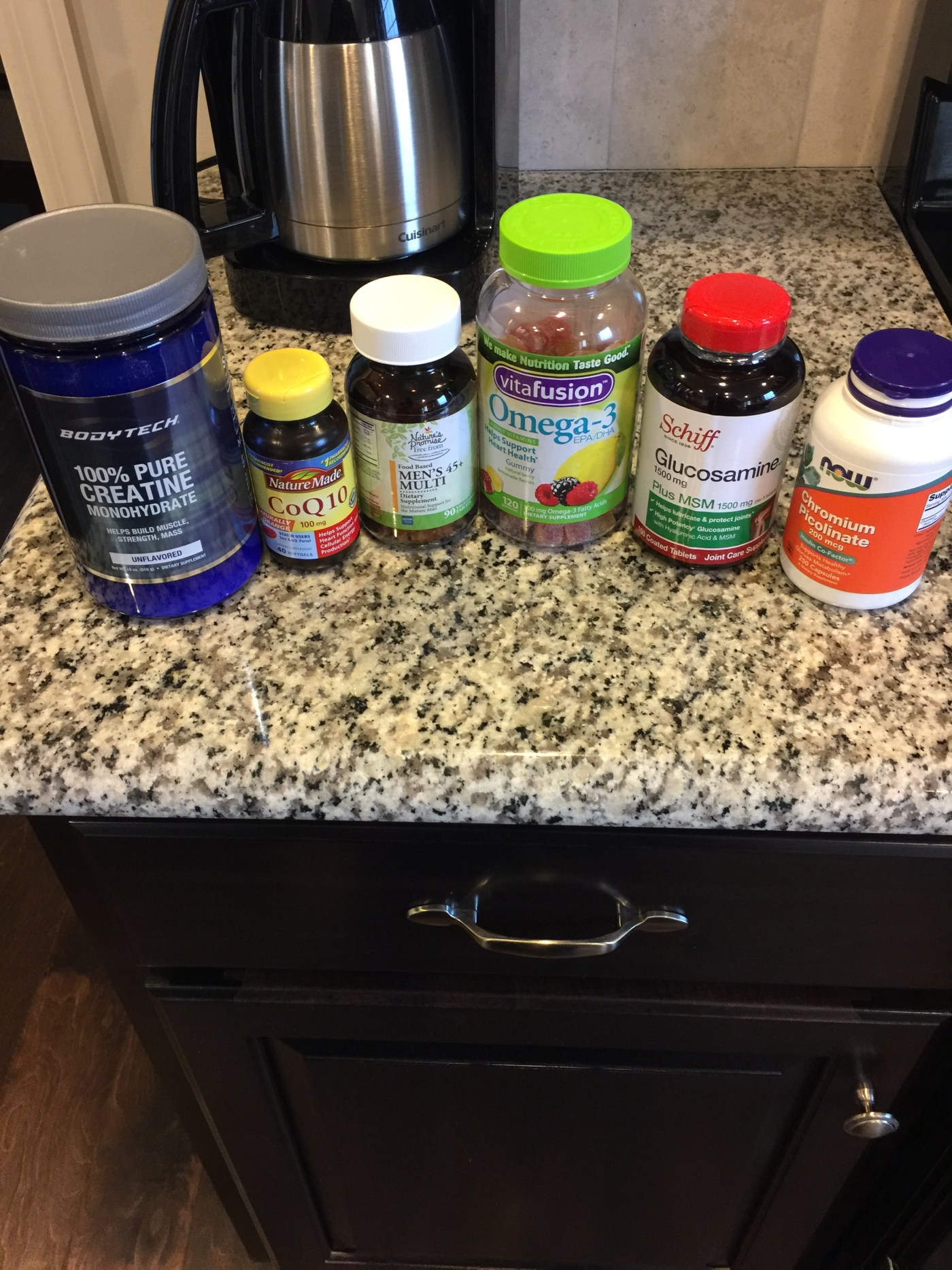 • Creatine – 5mg per day is recommended.  This was a surprise to me.  Isn’t this like steroids?  The first time I ever heard of this was with Mark McGuire and having it in his locker while being interviewed.  What sort of stunned me here was there are a LOT of articles stating this is safe and so much information about creatine is myth.  Most importantly, it seems high uses of it might have problems with kidneys, but we’re talking HIGH doses.  What I’ve been finding is that this helps with muscle recovery and energy.  It does add some weight gain to you (I saw .9%-3%), but this is water being added to your muscles – which is actually an extremely good thing for hydration.  So while it’s not going to help me lift twice as much, this might help me lift a little longer and help with recovery.