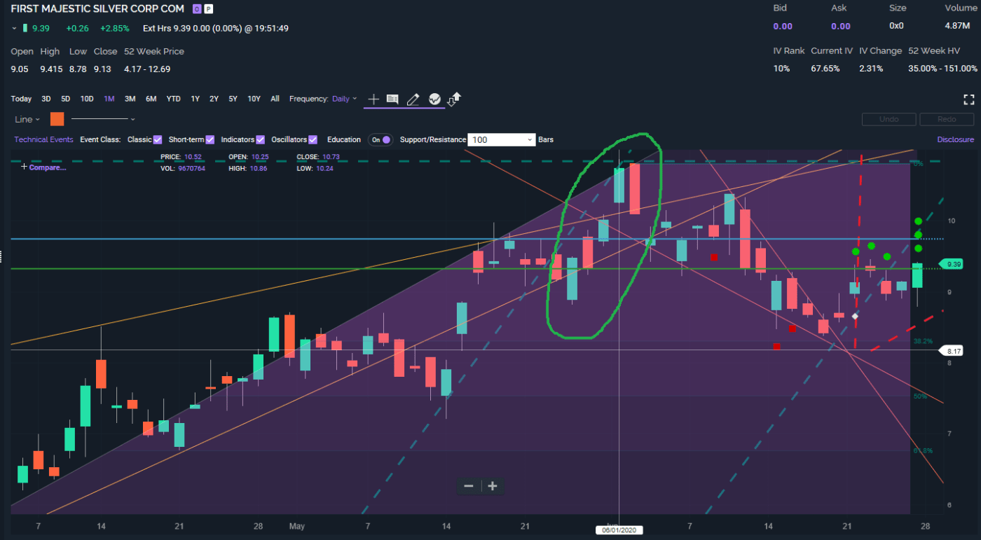 On the chart below, I bought AG option for $9 for Jul 2 at an average of $.47. It was at the second to last red candle on the way down.