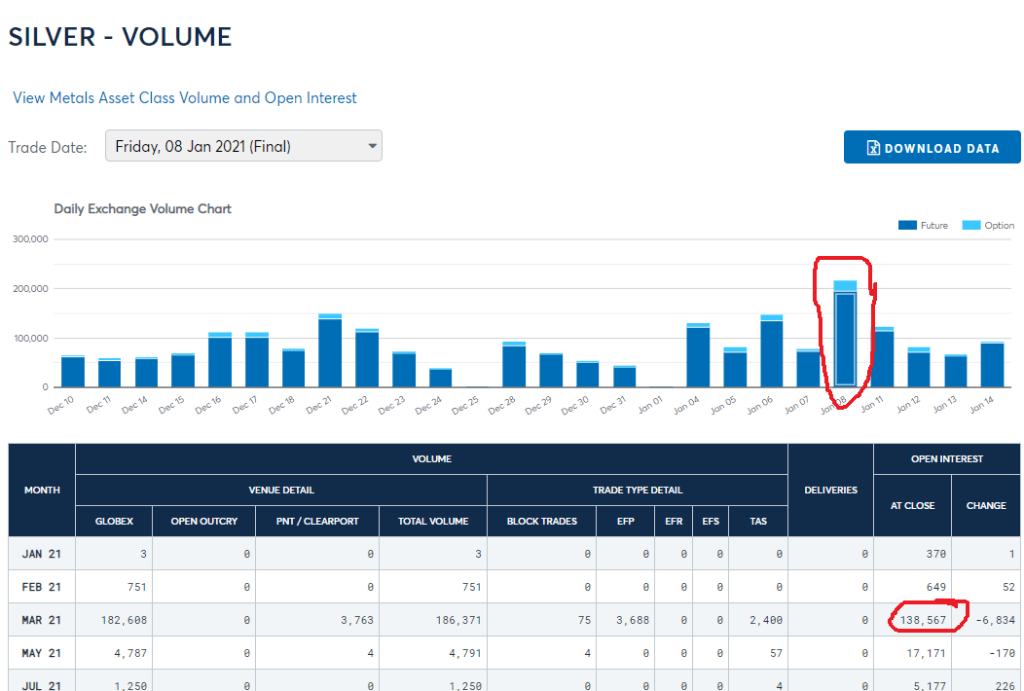 Each silver contract is 5,000 ounces. So, that red circle from the 8th shows over 200,000 contracts. This also shows 138,000 contracts in “open interest”. Meaning, these are contracts buyers and sellers agreed to. That’s 690,000,000 ounces that show they would want to take deliver in March. That many ounces. In as single month. On a single exchange. Where….probably 50% of this interest doesn’t have the metal or doesn’t want it. But yeah, that makes sense.