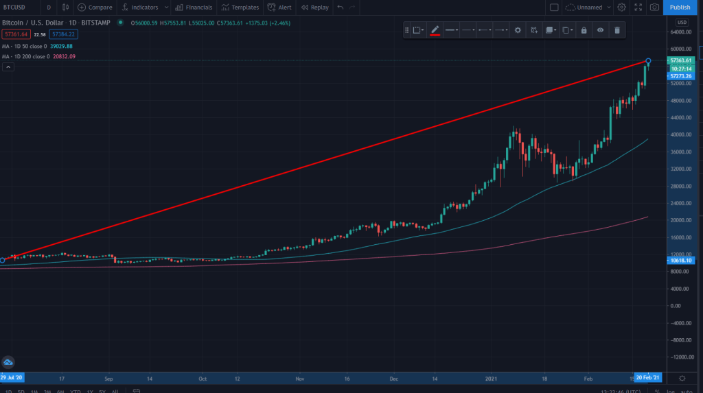 Let’s make an ASSUMPTION that this is a store of wealth that is more convenient than gold. What we are seeing is this STORE OF WEALTH increasing in a “risk on” scenario, by a LOT. To me, this screams speculative money chasing momentum. All of the hype machine is now in effect with – “more people to join”. This is a ponzi scheme, at this point. A STORE OF WEALTH is not meant to make you rich. The whole point of it is to store your “financial energy” into a form of “financial energy battery” that stores wealth during times of inflation. I used a scenario like this….assume today that $10,000 gets you a good used car. Maybe that’s about 5 oz of gold. If the USD fails and we go Weimar, then maybe a year or two down the road that used car may cost you $1m. However, the value of that gold would appreciate at the rate of inflation to then have you still use 5 oz of gold to buy that used car. THAT IS A STORE OF WEALTH.