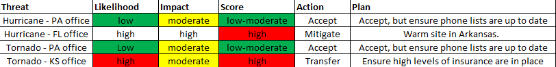 For example, one threat I may have is a hurricane to our operations. While the impact could be severe, the likelihood is extremely low for my location. However, if I lived in Florida, this likelihood would be much higher. Therefore, an IT manager where I am would evaluate that threat differently than one in Florida. In my current location, I may choose to accept the risk and do nothing, or transfer the risk with insurance, or if I lived in Florida, I may have to mitigate it with a hot site several hundred miles away for continuous operations. Each organization would have a different set of threats and risks. And – in the financial risk game going on, each person may have a different likelihood of occurrence for different threats.
