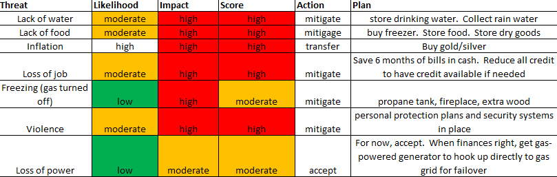 Section 2 would then discuss what you can do about these threats. Give ideas. Costs. How to prioritize. For example, above you saw me put “moderate” for loss of power and to “accept”. Right now, my primary focus is saving cash and storing food/water. However, as time permits, I’d like to get one of those generators that hooks into your gas line and flips over in the event of a power loss.