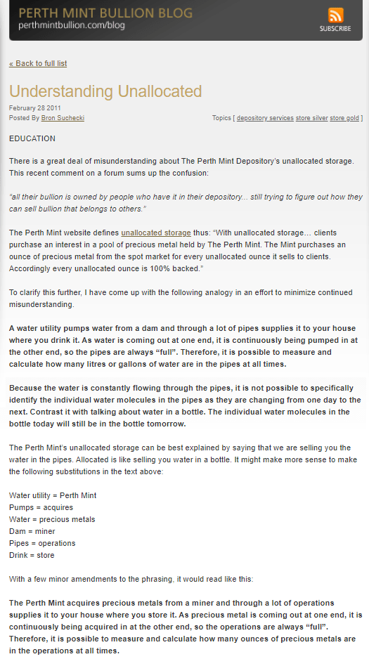 For example, if you buy 100 ounces of silver unallocated from Perth, they say they will buy spot and it is backed by metal. But what does “buy on spot” mean? You think they are running to the coin shop and seconds later there is metal sitting in that big pile above. If you look at their blog, it might mean they bought from a refinery, who then turns around and buys from a mine, who then needs to mine it, ship it, get it refined, and perhaps days, weeks, months later, it is in the vault. So they bought at spot with a paper claim of delivery at some point in the future, it seems. Could they even be buying a long futures claim and then stand for delivery if they need the metals? Don’t know, but this is how it sounds, if it’s not in their vault the next day.
