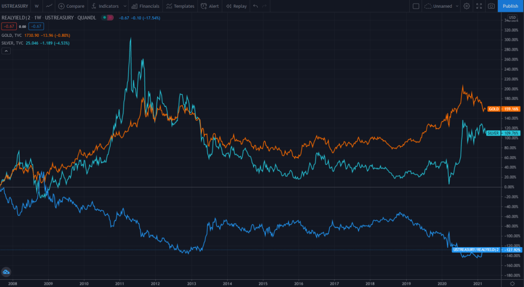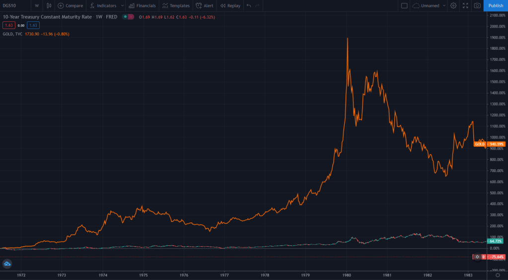 - The 1970s showed that during times of extreme inflation, the 10yr moved WITH gold and silver. This is because the rates of inflation were higher than the 10yr.