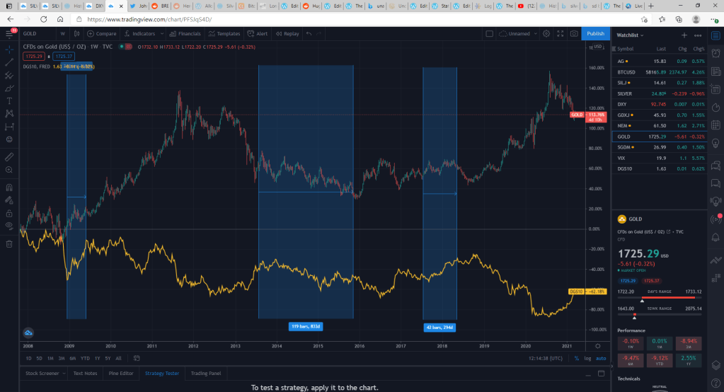 What many do is sort of track the 10 year as a proxy for this whole thing. If you overlay the 10yr with gold, you can see an inverse relationship – MOST of the time, with the exception of the periods in blue below.