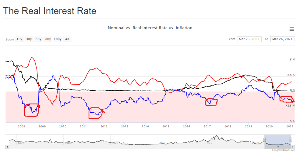 The problem with that is many estimate inflation is actually much higher. The 10yr is going up because….people know this and are seeing inflation. They realize that if inflation is 2.5% and the 10yr is 1%, it’s stupid to lose 1.5% of your money every year. They sell and put into gold, so to speak. As this 10yr rate increases, it is potentially showing LESS negative yield, at which the paper hands get out of gold and go back to the 10yr. I believe the Fed is calling this “transitory” due to their belief that this is all temporary supply chain issues due to COVID and prices will recede and normalize. They could be right.