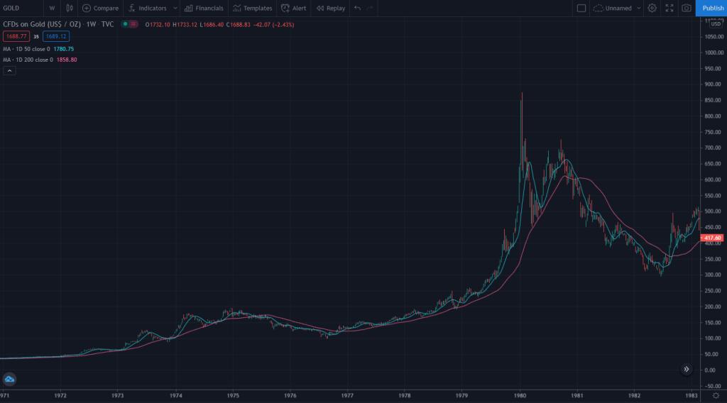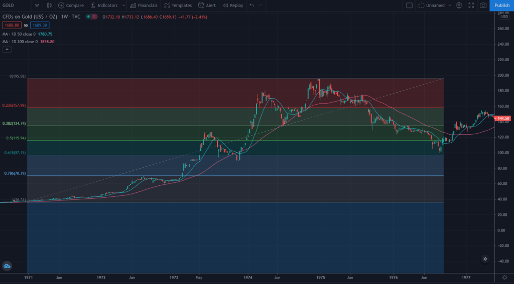 I’m not a gold analyst, I’m a silver bug. I wanted to try and dig into the gold charts to see if I could tell when the bottom would be in for gold, and it seemed somewhere around .618 at $1675 was the magic number. Who the hell really knows, but if we could look at what rhymes in history, I think we are close to moving up!!!