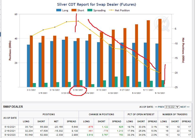 If you look since March 30th, it shows that the swap dealers are going MORE short into the price rise below. I stopped really caring about this chart because I have a lot of people saying different things trying to translate this to me. At face value, it appears they are shorting into a price rise, betting that at some point the price will drop and they can buy back.