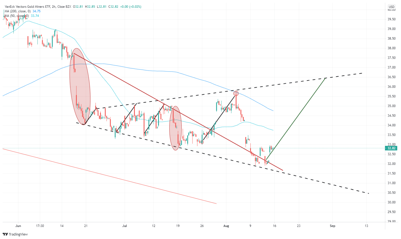 When you look at the GDX charts, there’s a couple things here with patterns I’d like to look at. This is a 2hr chart, which I don’t tend to look at much. But I did it because I wanted to probe more into the broadening wedge that, while bullish, has drawn a structure to it that stands out…