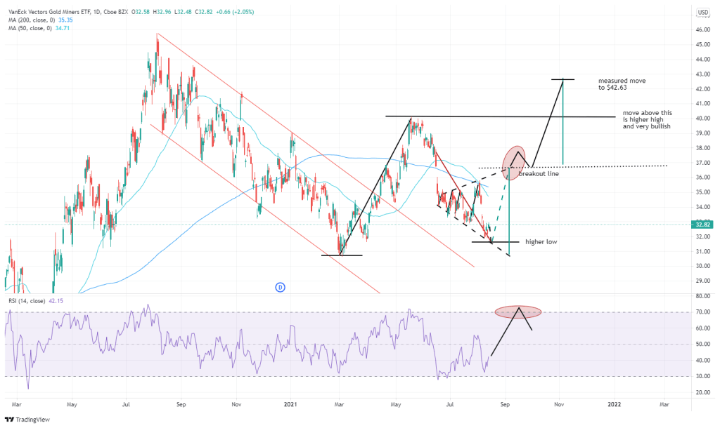 This is my bullish projection, IF we are starting a daily run up for a few weeks. You can see the wedge being completed somewhere around Sept 9th, perhaps at $37 or so. You then see it potentially break out from there, pull back, and then do the measured move up.