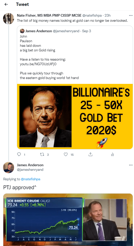 After this, I saw how James Anderson on his weekly videos tweeted about John Paulson with bets of 25-50x on gold. I re-tweeted, then got a reply from James!! Made my week 🙂