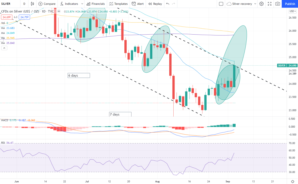 - We still have potentially a few days left in the recovery of silver – up to 8 trading days before the 18th. RSI is not 70 yet. We just tested the 50dma but it’s possible in the next few days we go over the 50dma and bots/algos start buying