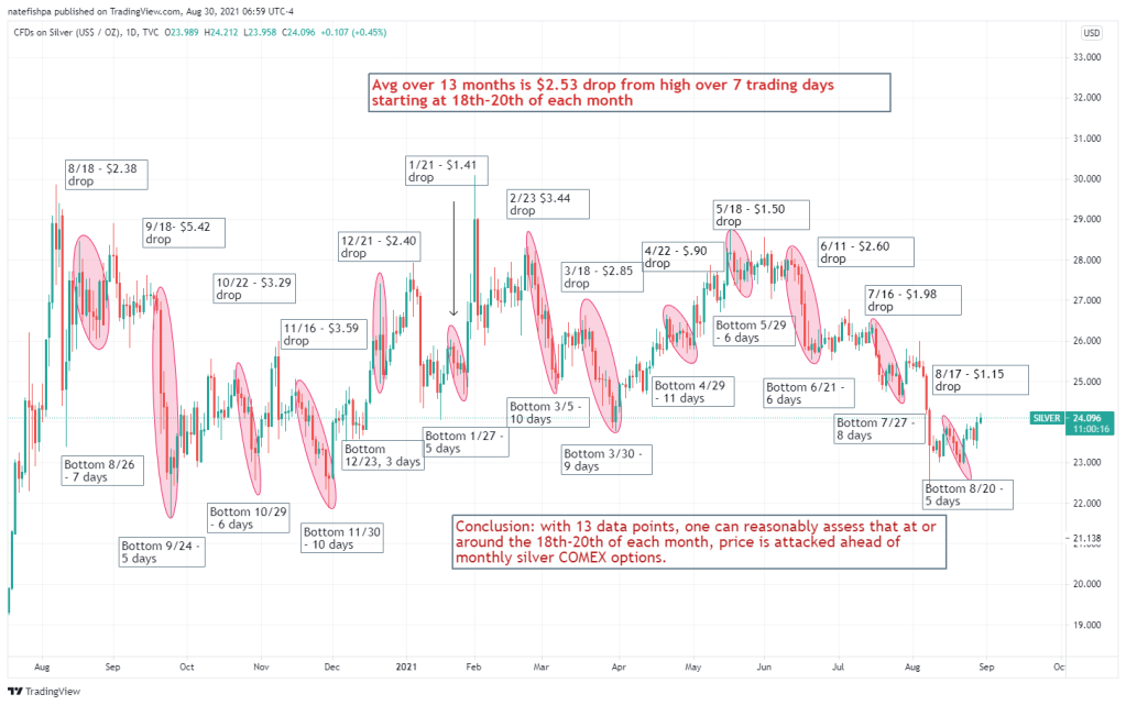 I picked 13 days because I have noticed a pattern where the silver “beat down” starts around the 18th-20th ahead of silver futures expiration. I’ve shared the charts out on Twitter and on here a few times, but today is the 5th – so what can happen between now and the 18th?