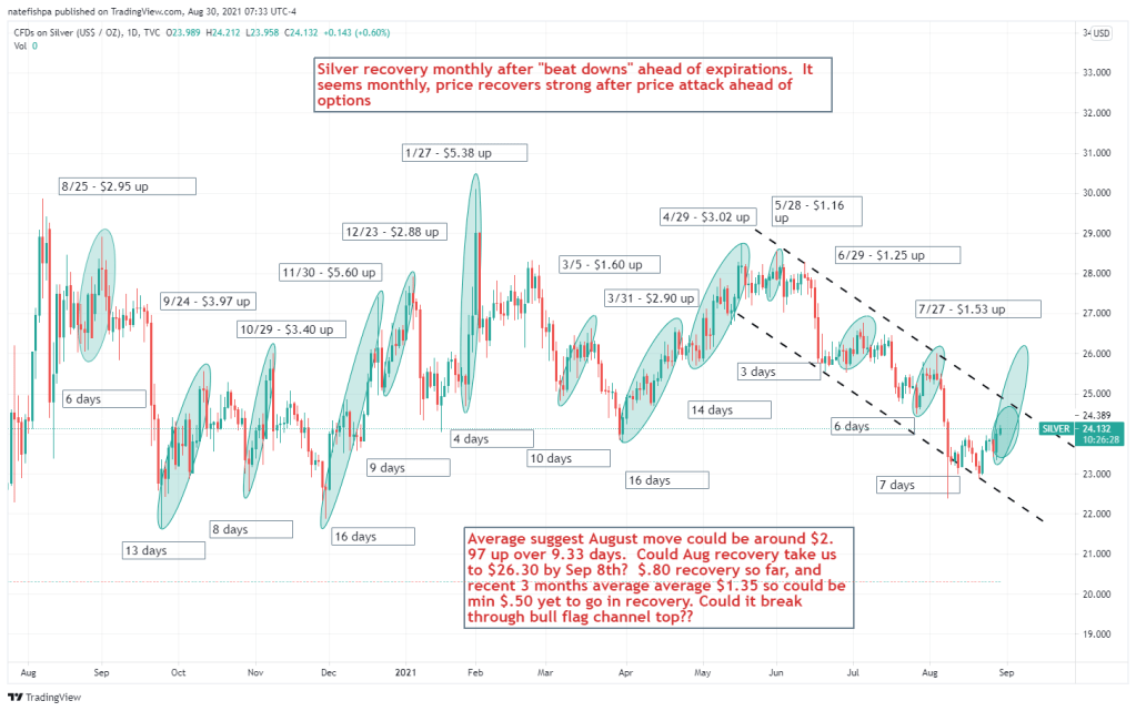- Silver recovery has now hit 6 days. Avg recovery is 9.33 days. Some have been lower than 9, some higher. Avg recovery is $2.92 with some REALLY high numbers skewing this higher. This recovered about a $1.40 so far from options expiration. With $2.92 being skewed higher by some crazy numbers, I’d bet we don’t have a lot of movement yet in silver.