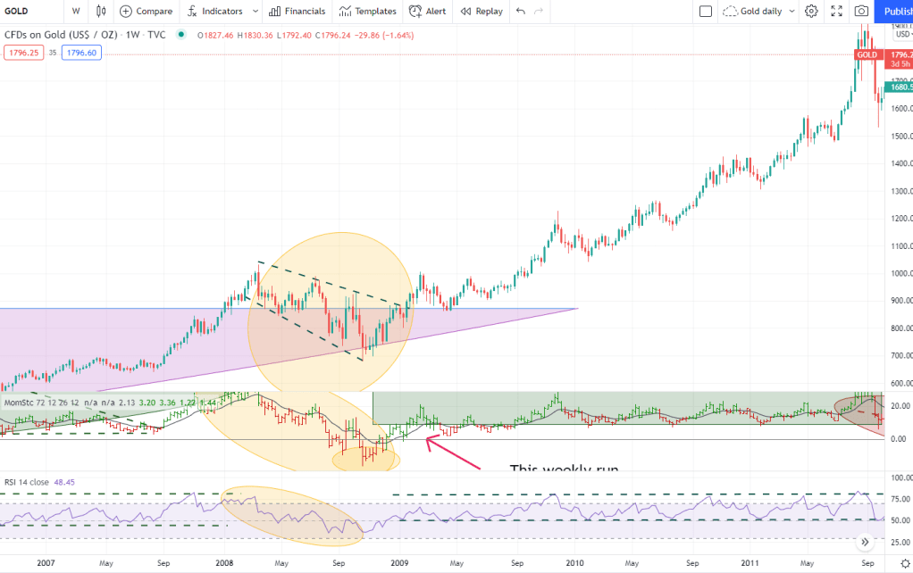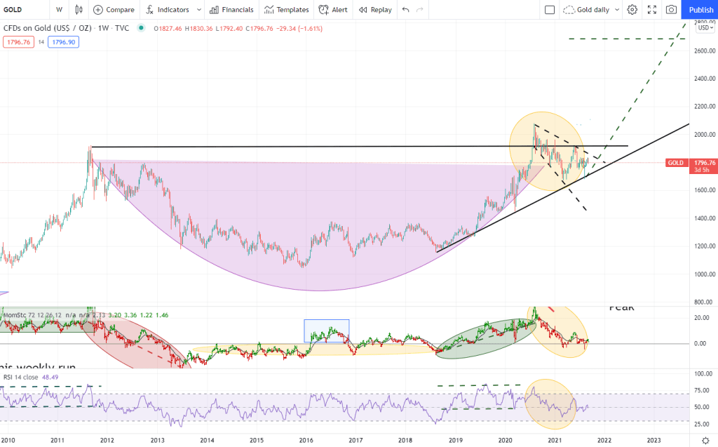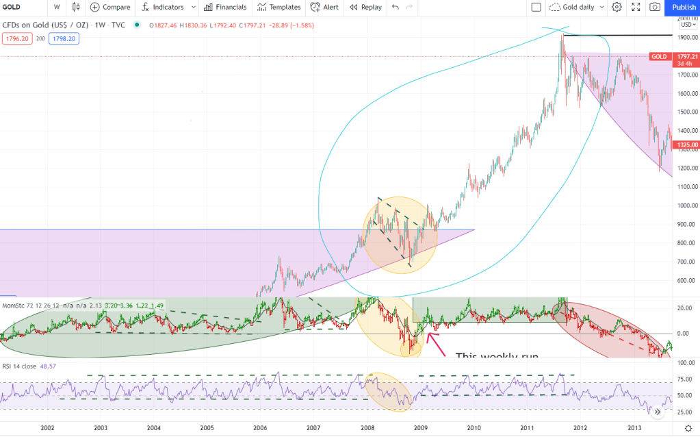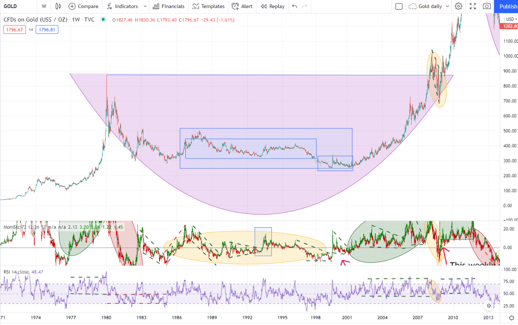 The bottom isn’t as rounded as the typical shape, but all phases are there. In the middle, I drew a lot of colors with Michael Oliver’s momentum structures and the bottom you can see RSI. Arcs tend to have this pattern which I can get into for the 2011-2021 run up in a sec.