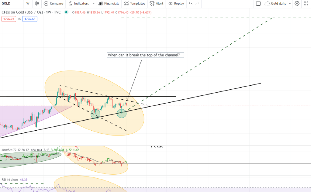 This looks extremely familiar, doesn’t it? While many thought the end of May was the time the chains would break free and make a move above the channel, gold had other ideas in mind. Recently, Michael Oliver on NorthStar Badcharts YouTube channel mentioned that momentum is indicating that a WEEKLY close above $1865 gold and $26 silver is THE indication it is on like Donkey Kong.