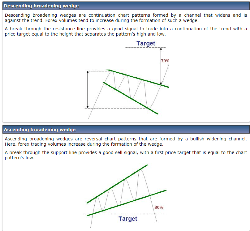 When you look at the gold charts, you see what’s called a broadening descending wedge, which is listed as “bullish”. Remember, these TA charts are probability-based. Not bible. Take a look at the gold charts…