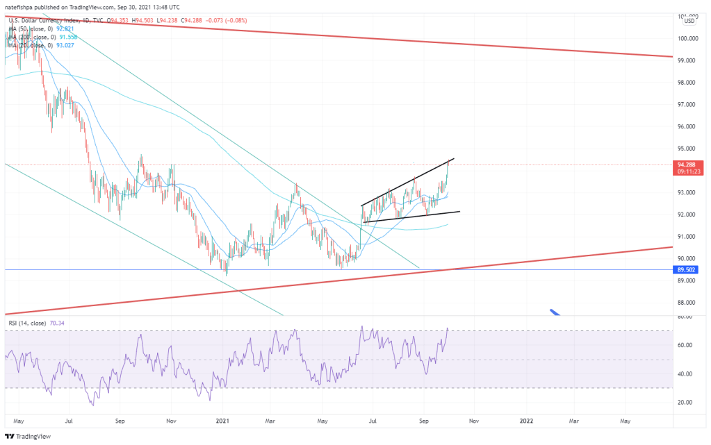 But if we look at the DXY, it’s the reverse type of wedge – suggesting there’s a down move in the future. This also has a pretty high RSI.