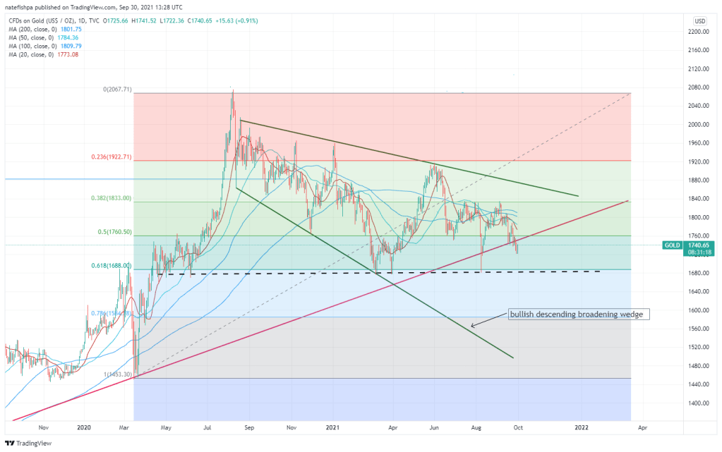 - gold in a descending broadening wedge pattern potentially looking at trendline support OR 1675 support. IF trendline support holds, gold could force shorts to cover.