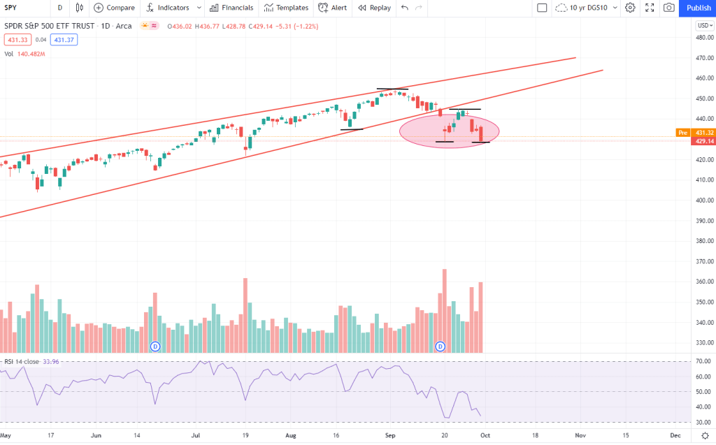 At 0630 on 10/1, we saw a big rally yesterday. Looked like this silver smash got a V recovery of sorts. While several of these miners appear to have a head and shoulders pattern completing, it is starting to form a Michael Oliver-like argument with the arm wrestling match. What I think I need to see over the next week is the fork of gold vs equities. I saw this leading up to the March 2020 smash. Meaning – markets corrected by another 500 points or so and gold was way up.