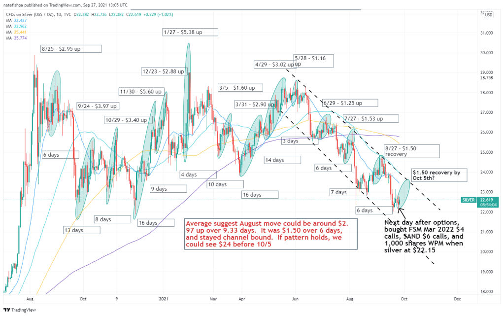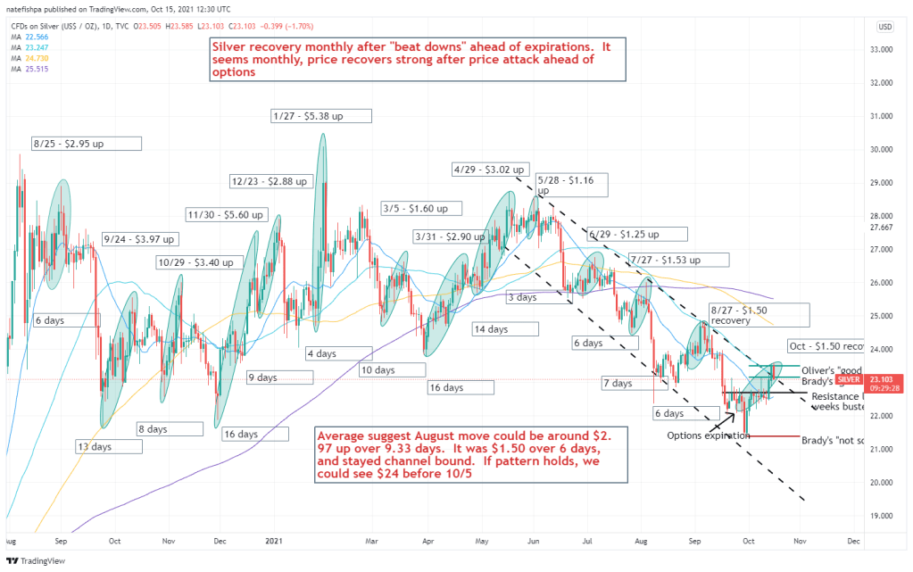 As of this writing, we are at $23.21. It’s before the usual morning mini beat down, so by the time you read this we could have a $22 print in silver. My patterns show about the 18th or so beat downs begin, but this month the monthly options are a little later on 10/28. So – perhaps the beat downs don’t start until perhaps the 20th. Don’t know.