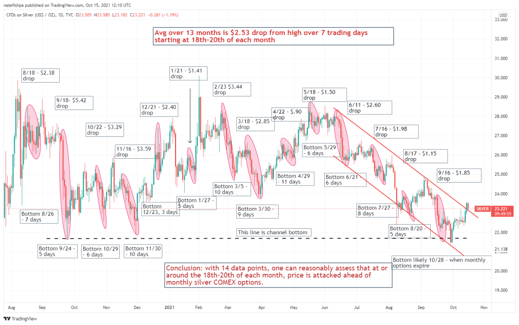 With the options I have, I’m trying to play some saw tooth patterns. What I have shown everyone a few times now is that every month, I’m seeing metals smashed down starting AROUND the 18th of the month. My hypothesis is that this is around the futures monthly options expiration. What I then see is immediately after the options expiration, a recovery period happening until the next beat down.