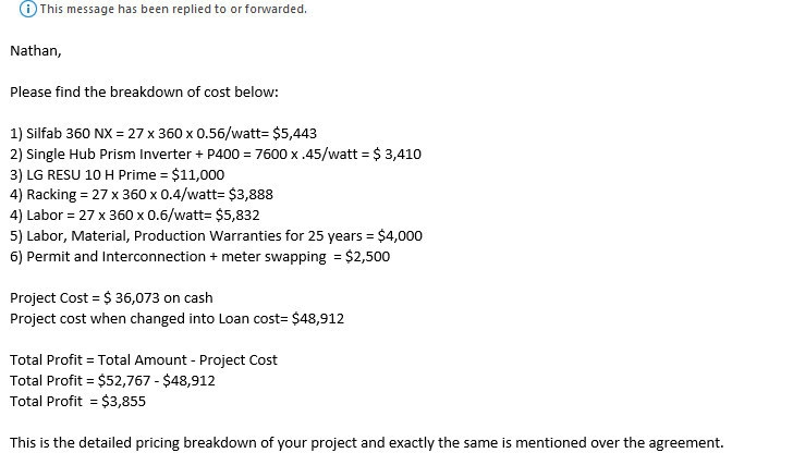 Furthermore, I read the contract briefly and it mentioned that they reserve the right to change the price based on costs of things going up. So – I wrote back and asked for a breakdown of costs for their estimate. My guess is they will also deny me. Question, if a panel costs say…$1,000 and you don’t tell me the cost is $1,000, what’s to stop you from immediate jacking your price up 5-10% after I sign the papers simply stating “higher solar panel costs”. Look, I don’t want to tell you how to run your business, but if you are giving me an estimate, EITHER break down the prices for me OR bake your profit into the estimate and if you have cost overruns, that’s on you. But for you to simply not break prices down, then reserve the right to change the price at any time is…..SHADY.