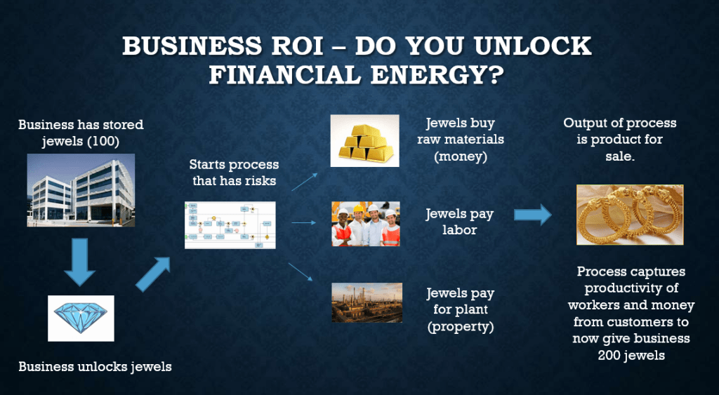 When you unlock or take financial energy out of your money and move it to business, you expect an ROI. Meaning, you have $1800 in gold and convert to currency (which is a massively depreciating thing due to inflation, so you are a fool to hold cash for long) and then move it to a business.