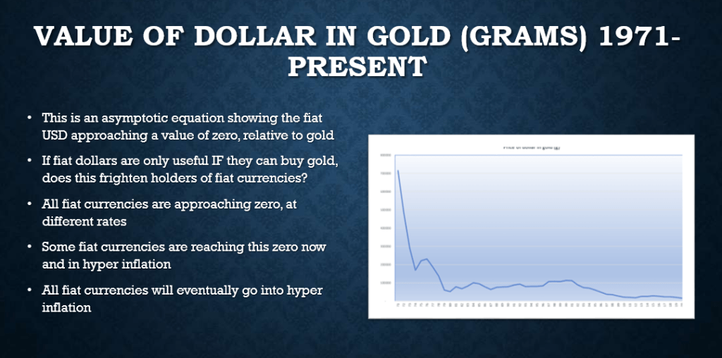 He said something like “money doesn’t have to be physical”. This may be where he’s wrong. IF you have any thoughts on Mises Regression Theorem, it states essentially that a currency only has value as long as it can buy gold. Now, I have showed you the value of currency in grams of gold over 100 years. How much longer can you perhaps buy gold with dollars? Maybe awhile yet.