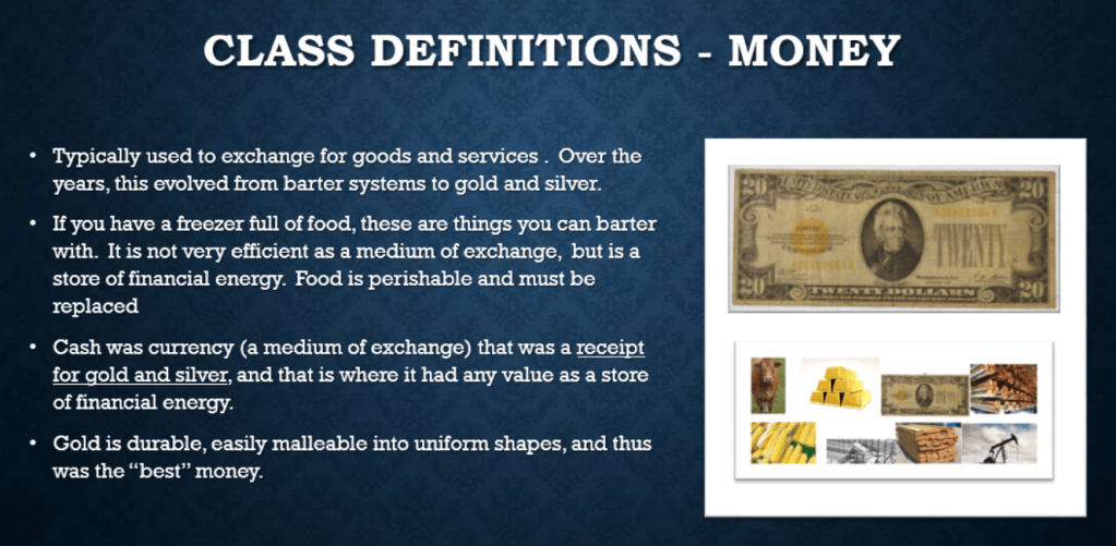 My definition of money in respect to financial energy includes very liquid assets, gold, silver, commodities, etc. Think if you have a rolex laying around. It is not “money” like you think, but if a depression hits and you need money, it is extremely liquid and it holds a value. The most EFFICIENT forms of money evolved to be gold. But if you look around your house for items of VALUE, you can see toys you may have bought your kid for $200 might be worth $5 at a yard sale and the rolex you have may have retained all of its value. I felt it important to put these in a big bag of things for this conversation. You’ll see why in a moment.