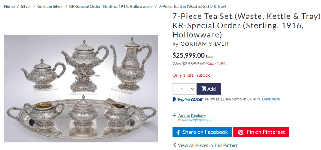 The reality in the United States of Murica is that a vast majority of us are paycheck to paycheck and when grandma dies, we have an estate firm come in and give us a few hundred bucks for everything. Then you go to these events and there are bargain hunters trying to find treasures on the margins and find these things at auctions for cheap. Meaning – 95% of our country is blue collar, rural, suburban, and doesn’t have $26,000 tea sets. We have a box of shit left to us with some shiny stuff next to a box of carnival glass shit next to a box of clothing shit next to a box of rhinestone shit. We take the box of shiny stuff to someone to tell us how much it is worth, and they more or less lie to us, give us pennies on the dollar, and we are happy with a few hundred bucks.