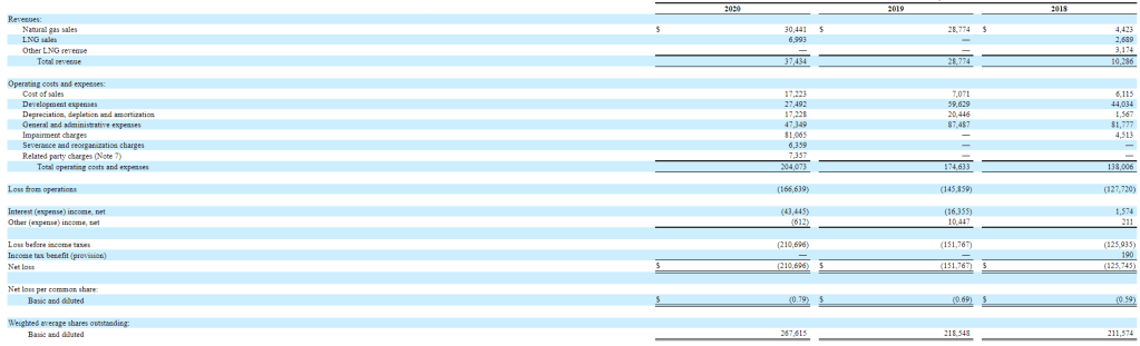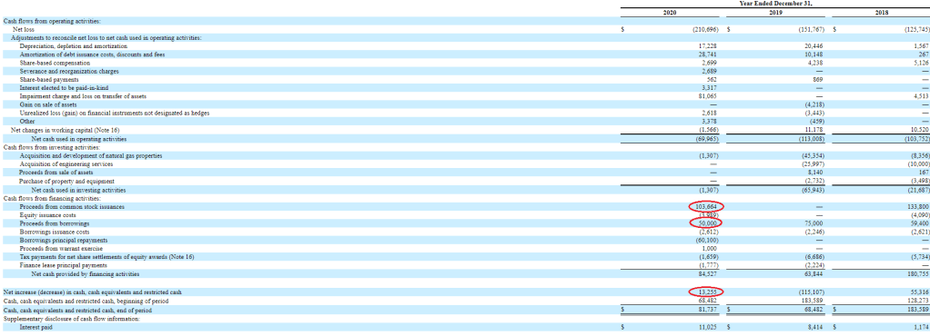 So let me check their 10-k for annual report. Let’s see how their finances look? It looks like they have $64m in debt and $37m in revenue. These guys are not Exxon type players, is my first reaction. I later found a list of the top 15 natural gas producers, and to put it into perspective, the 15th largest had a market cap 30x this and revenues 100x. However, TELL seems to have losses per share the last few years. Total shareholder equity looks to be about $109m market cap – Etrade has them at a $1.2b mkt cap – so not a small company, but not a $40b Exxon. It was $167m at the beginning of 2020, but we also saw what Mar 2020 did to everything. It looks like they had $13m of positive cash flow, but it seems they issued $103m in stock, and we might be seeing share dilution as the reason a lot of this is having problems. They also borrowed $50m. This seems to me the equivalent of a junior miner company when you compare it to the big boys.