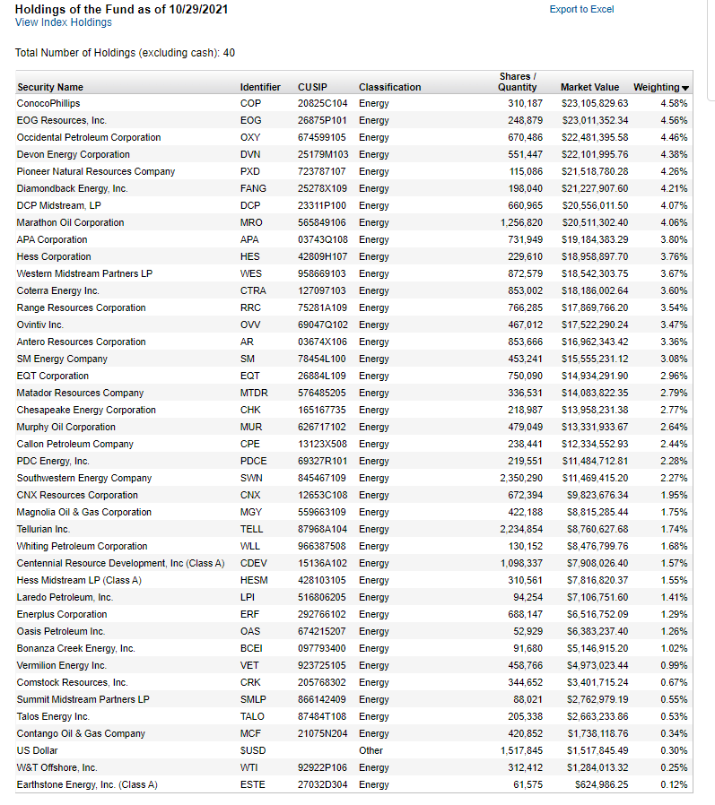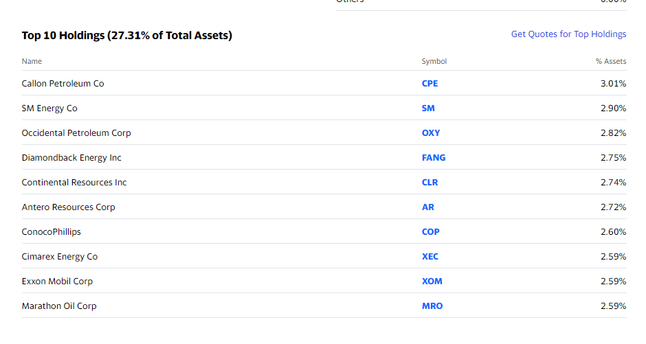 Let’s see if we can find what companies are in the XOP and FCG ETFs? These last two MSA looked into, and are not recommending – but this at least tells me who some of the major companies are?
