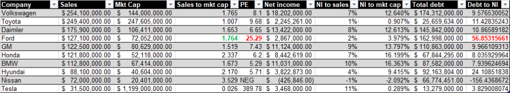 - The sales to market cap of Ford is more or less in line with its peers. So not crazy high market cap. Ford had a 1.76. Tesla had a .026. Meaning – the revenue coming in to their peers based on market price is within range – it’s just it seems they aren’t running a very efficient company, at this time.