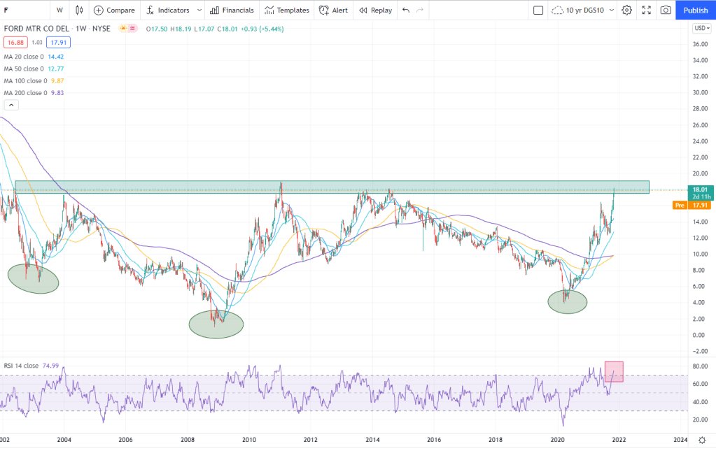 This is NOT financial advice. I am NOT a financial advisor. I am a Ford 150 Lightning fanboy and I’m interested to see if there could be a “Tesla effect” to the Ford stock price. First, I want to look at stock price fundamentals to see where we are.