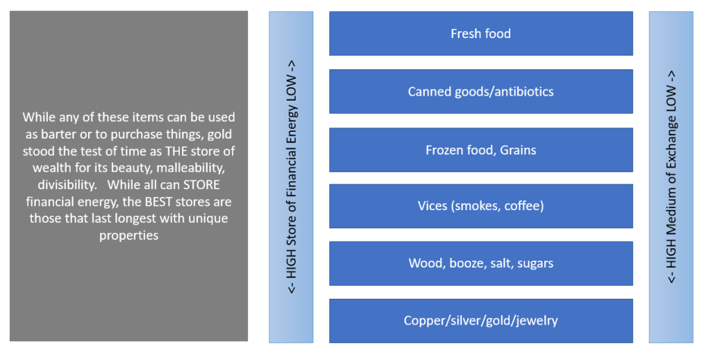 With this category, you have a scale of how long something is good for which can determine it’s store of financial energy. This is why if SHTF, they say “you can’t eat gold”. Why?