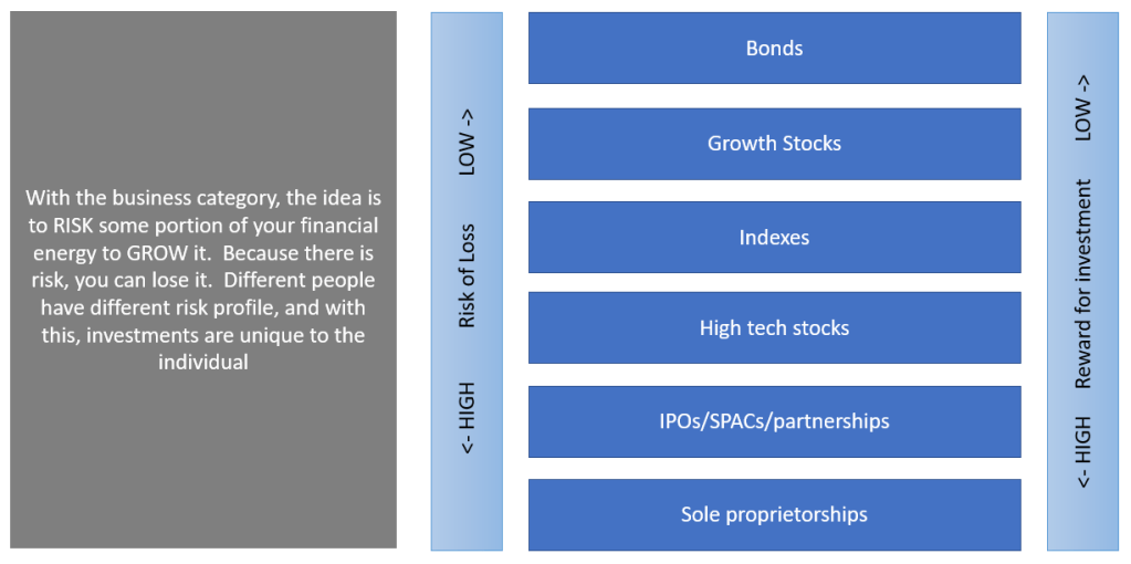 This is how you take things from money and make things that go into all asset classes. How things are measured here is the risk against the reward. Meaning, low risk things may grow slowly. Higher risk things may grow much more quickly – but there’s a risk of loss here, and you are rewarded more when higher risk items hit – but you are penalized more when they fail.