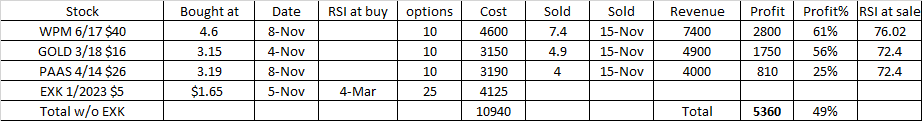 I never sold those EXK options, so I didn’t add them to the total cost or the profit/profit margin.