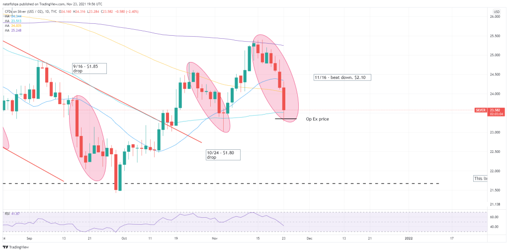 With silver, you don’t have the pretty line, but we are tracking the $2.10 bear down, and this looks to be a higher low. IF IT HOLDS