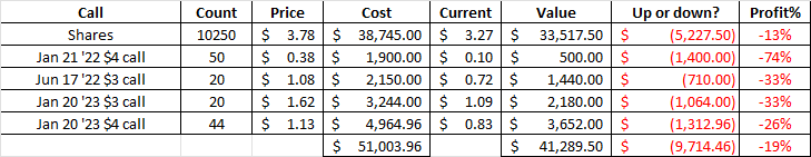 Didn’t look so good. I lost another $2,000 or so on December calls – some I sold back a little early for a 14% haircut, others ran to zero. In my INITIAL writing, I mentioned the short term calls were SUPER risky, but worth holding. The news came literally DAYS after the options expiration on Friday. Sorry, but this cannot be a coincidence. Had this been announced on Weds of last week, that potentially would have added $10k to my portfolio. C’est la vie. I hedged that risk with longer duration options AND a ton of shares. IF all of the options had gone to zero and had I waited enough time, I felt I could have broken even with the share price regaining ground.