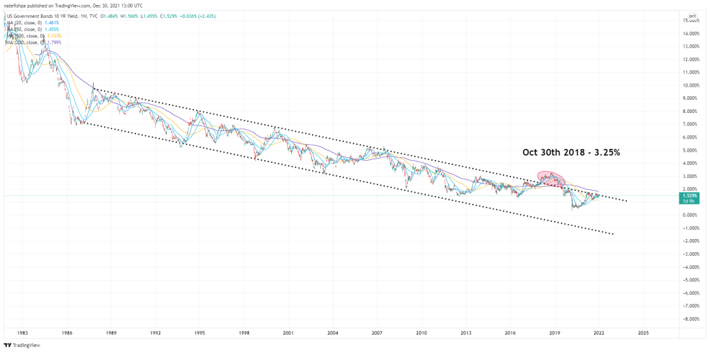 We now have an issue – where we see the weakness in the supply chains. Global conflict today may reverse this course and we may need to produce more at home. This is inflationary because now we may have to pay those union wages rather than getting cheap goods from China. And with this, rates will go up – as we are seeing higher inflation – and supply chain problems – leading many to believe that rates can only go up so far before we risk defaulting on our debt.