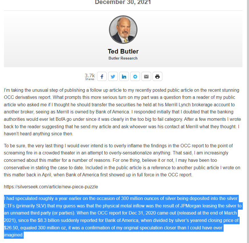 Bank of America leased 800m oz of silver from JP Morgan and then sold this all into the market. The net effects of this claim by Ted essentially are that by selling this all it helped depress the silver price AND when silver price rises, BoA is about to lose their shirt to the tune of $800m per dollar move up in silver – which could take them down.