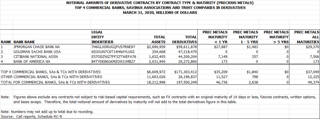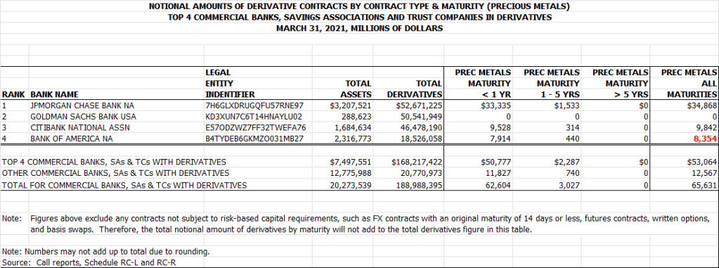 This shows JPM with $27b in PM derivatives. Does this mean they leased 1.2b oz of silver from someone else? No. At issue is I do not know what the $18.2b derivative is for BoA, and I do not know what the $27.6b derivative is for JPM. To me, I think a lot of this is unknowable by someone like me. Which means my purpose here is not to speculate on what it is, but ask more probing questions to get better or more complete answers.