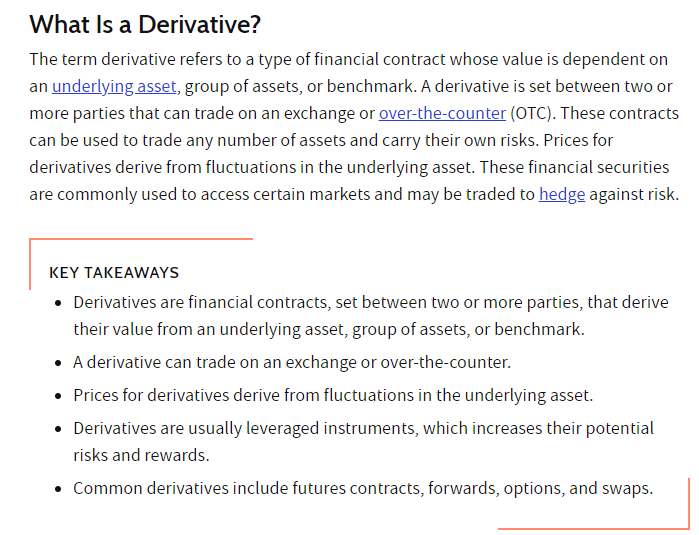 When you go to the OCC site, you can review publications. In his article, he mentioned the derivatives publication. Let’s FIRST look at what a derivative is.