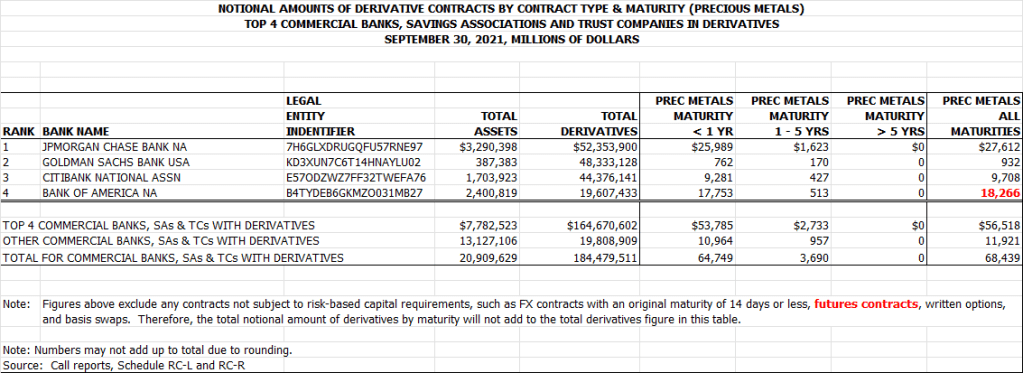- This report shows banks’ derivatives. What is lost in the silver noise is the report on Table 13. BoA has over $20 TRILLION in derivatives. I think people haven’t put this into perspective here. This means the silver derivative is 1/1000th of all of their derivatives. I really want you to let this sink in. It doesn’t mean it isn’t egregious to the tiny silver market. I just want you to put into perspective that their silver derivative isn’t a bank killer. Most derivatives appear to be US bonds/treasuries. And, you do not know the terms of the silver/gold leases.