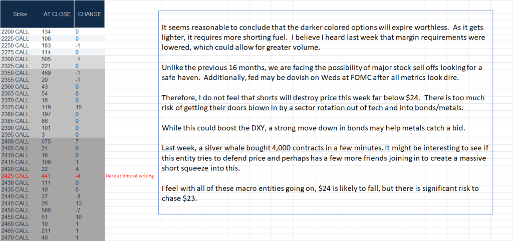 - IF they chase after higher numbers of calls for a smash and grab, $24 seems like a likely target. You can see a high number of calls at $23. And, that is within the $2 smash range. So, it is possible they can smash $1.30 or so in 3 days to take it under $23.
