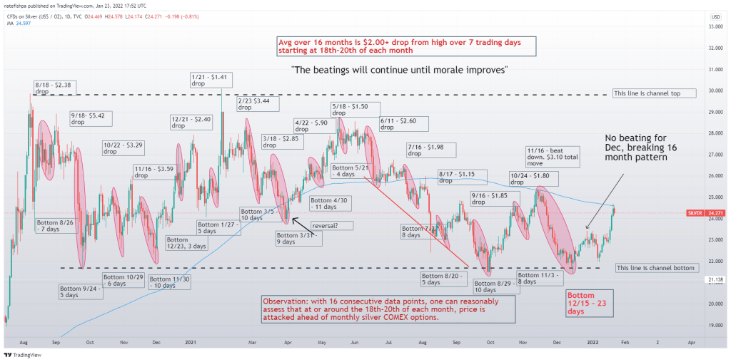 We had a trading channel for the last year and a half or so for silver. We have bounced off the top and bottom of this – and during this time, we have had an average closing price of $25. My chart popped that out for me. I had been tracking beat downs and recoveries – meaning, every month a few days prior to metals monthly options, you would see the price get clubbed. I’m not talking $.14. I’m talking at 8:30, you see “retail sales improved by .001%” and silver gets smashed a dollar. They would often tend to use these things as cover. Then, you hear the muppets on CNBC say things like, “silver took a beating today, as investors feared strong retail sales could ding the luster of the white metal”.