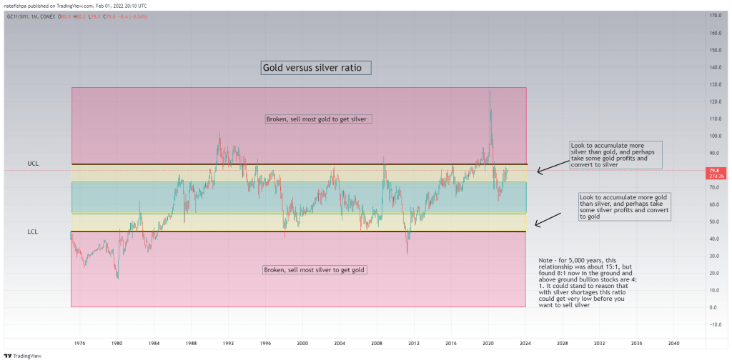 Right now, it’s on the upper band of “buy silver” or perhaps selling gold to buy silver. When it gets in the green, people may buy 1:1. When it’s on the lower end, you are selling silver to buy gold.