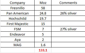 Of this entire list, who is silver primary producers? You can list these with confidence: Fresnillo and Hochschild. That is about 78m oz. The problem here is Pan American is NOT a primary silver producer, as it produces around 26% silver now. Fortuna produces around 7m oz, but they are also only 27% silver. Both of these companies now are junior to mid tier gold producers (PAAS has less gold as a percent than FSM) and as such, should not be identified as PRIMARY silver miners. First Majestic added Jerritt Canyon and with this, may be closer to a 50/50 gold to silver producer, but they are still claiming 60% for now. Maybe we can split the difference at 55/45 silver to gold.